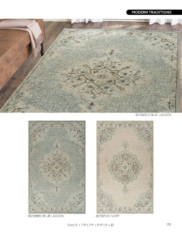 MODERN TRADITIONS MODERN TRADITIONS 81289SGG SEA GREEN GRAY 81290BEI BEIGE 81291BEO BLUE LAGOON 81289SGG SEA GREEN GRAY 81291BEO BLUE LAGOON 81292IVO IVORY 101 Sizes 5' x 7'9" | 7'9" x 9'9" | 9' x 12' Sizes 5' x 7'9" | 7'9" x 9'9" | 9' x 12' 102