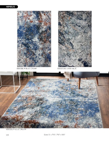 NIMBUS NIMBUS 81831BLM BLUE CREAM 81832GBU GRAY BLUE 81833GYB GRAY BLACK 81831BLM BLUE CREAM 81833GYB GRAY BLACK 81834GYR GRAY RUST NEW ADDITION 119 Sizes 5' x 7'6" | 7'6" x 9'6" Sizes 5' x 7'6" | 7'6" x 9'6" 120