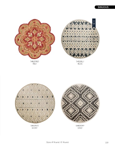 SINUOUS SINUOUS NEW 54108RED 54109GML 54110RED 54111BLU RED GRAY MULTI RED BLUE 54112IVO 54113GRY IVORY GRAY 54108RED RED 129 Sizes 4' Round | 6' Round Sizes 4' Round | 6' Round 130