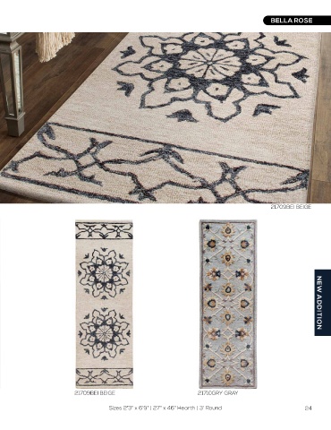 BELLA ROSE BELLA ROSE 21706BEI BEIGE 21707GRY GRAY 21708MLT MULTI 21709BEI BEIGE 21706BEI BEIGE 21709BEI BEIGE 21710GRY GRAY NEW ADDITION 23 Sizes 2'3" x 6'9" | 27" x 46" Hearth | 3' Round Sizes 2'3" x 6'9" | 27" x 46" Hearth | 3' Round 24