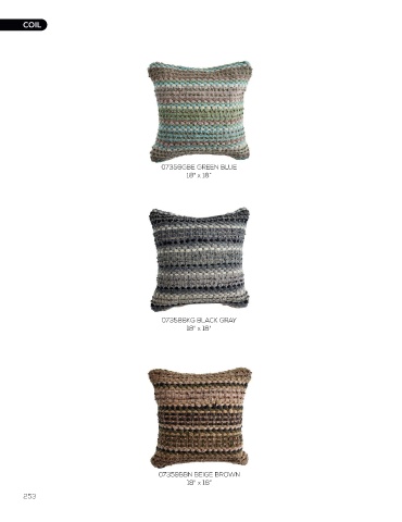 COIL COIL 07356GBE GREEN BLUE 18" x 18” 07358BKG BLACK GRAY 18" x 18" 07359BBN BEIGE BROWN 07359BBN BEIGE BROWN 18" x 18” 253 254