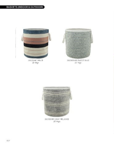 BASKETS (INDOOR & OUTDOOR) BASKETS (INDOOR & OUTDOOR) 16035MLT MULTI 16036SWB SWEET BLUE 21" High 21" High 16039GRM GRAY MELANGE NEW ADDITION 21" High 16035MLT MULTI 427 428