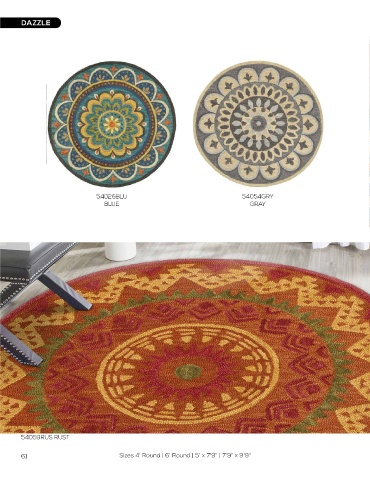 DAZZLE DAZZLE 54026BLU 54054GRY BLUE GRAY 54026BLU BLUE 54059RUS 54062BLK RUST BLACK 54059RUS RUST 61 Sizes 4' Round | 6' Round | 5' x 7'9" | 7'9" x 9'9" Sizes 4' Round | 6' Round | 5' x 7'9" | 7'9" x 9'9" 62